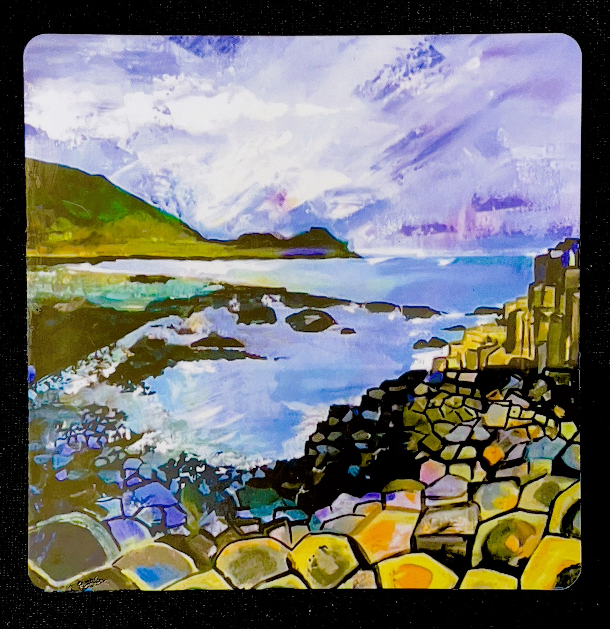 10 x 10 cm coaster with a cork backing. There are 9 in the collection